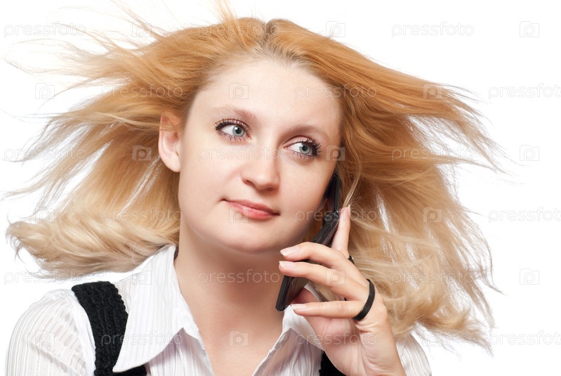 Молодая женщина с мобильным телефоном. Изолирована на белом фоне