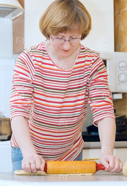 Женщина в возрасте раскатывает тесто на кухне