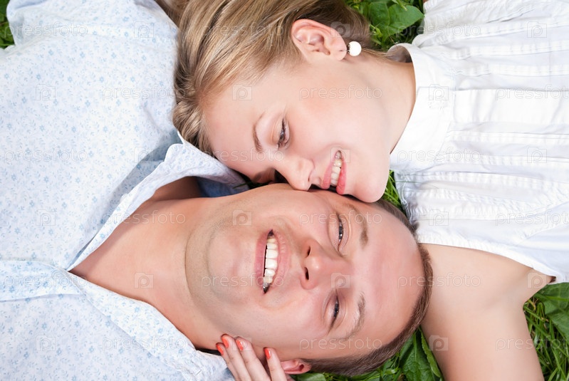 Влюбленная пара на газоне в парке