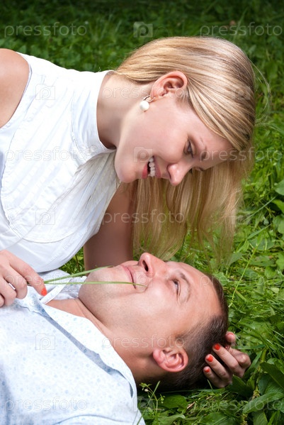 Влюбленная пара на газоне в парке