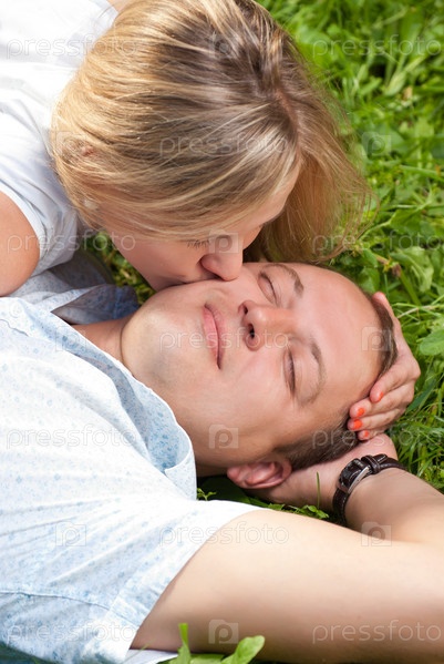 Влюбленная пара на газоне в парке
