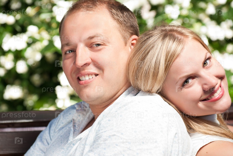 Молодая пара сидит на скамейке в парке