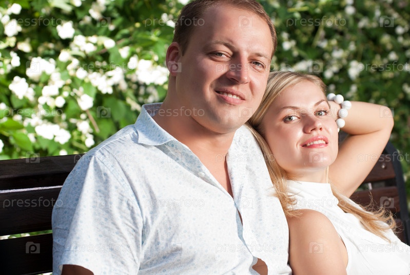 Молодая пара сидит на скамейке в парке