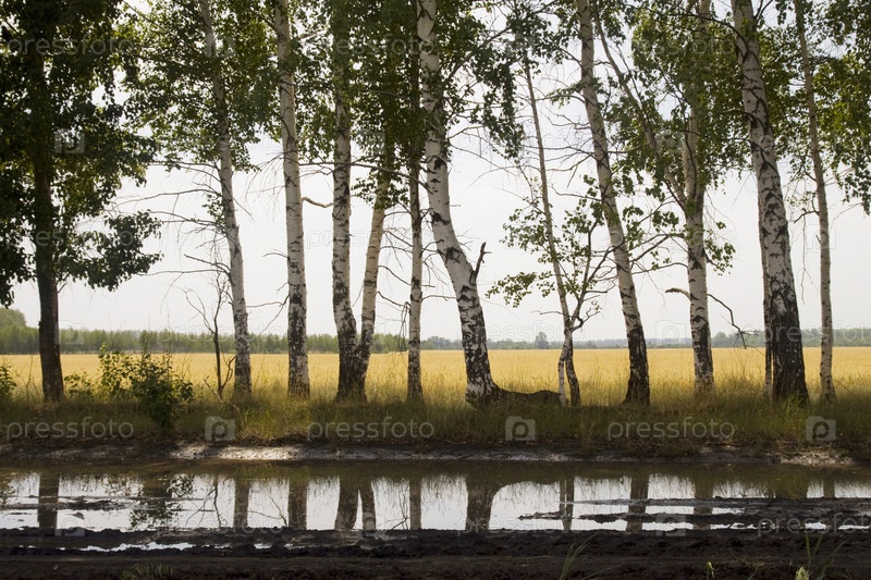 Летний пейзаж: березы и их отражение в болоте