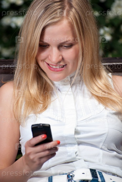Молодая женщина с мобильным телефоном в парке