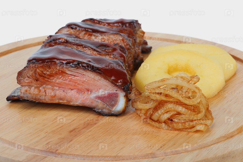 Свиные ребрышки с жареным луком и яблоками