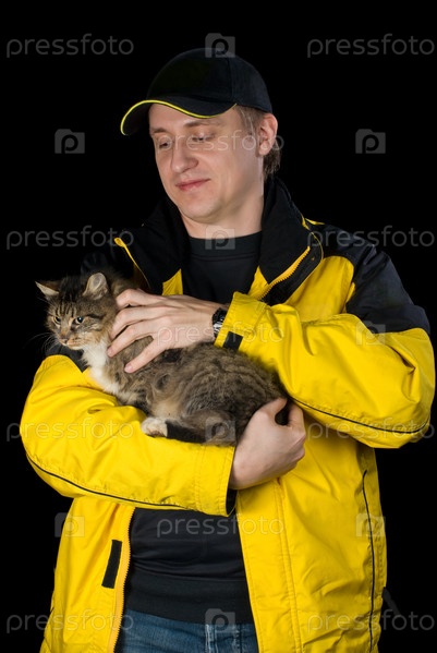Мужчина со своей любимой кошкой, изолирован на черном фоне
