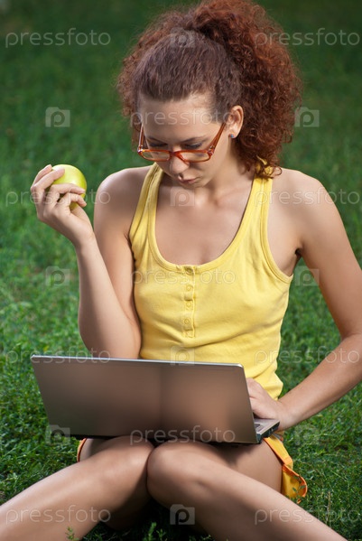 Рыжеволосая девушка сидит на зеленой траве с ноутбуком и жует яблоко