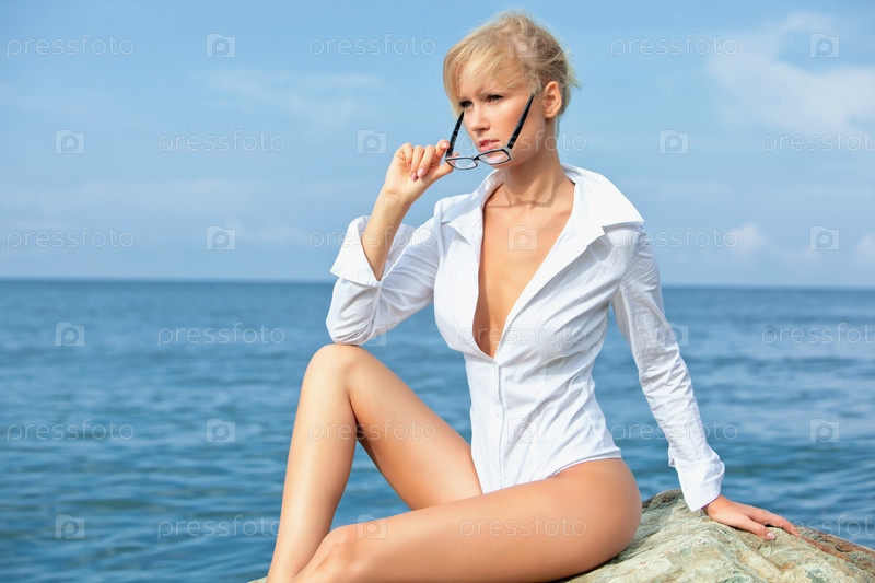 Молодая женщина позирует на берегу моря