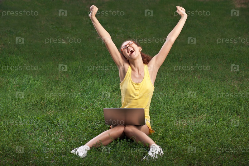 Радостная девушка сидит на поляне с ноутбуком