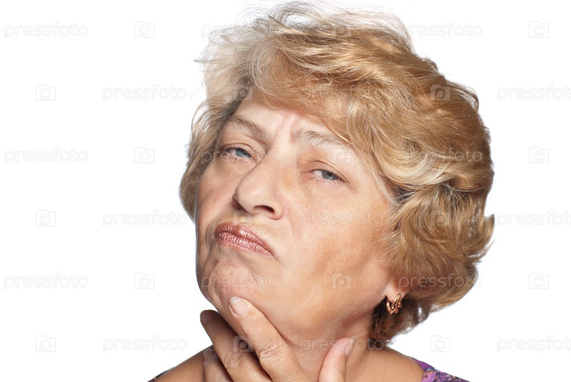 Пожилая женщина размышляет о чем-то на белом фоне