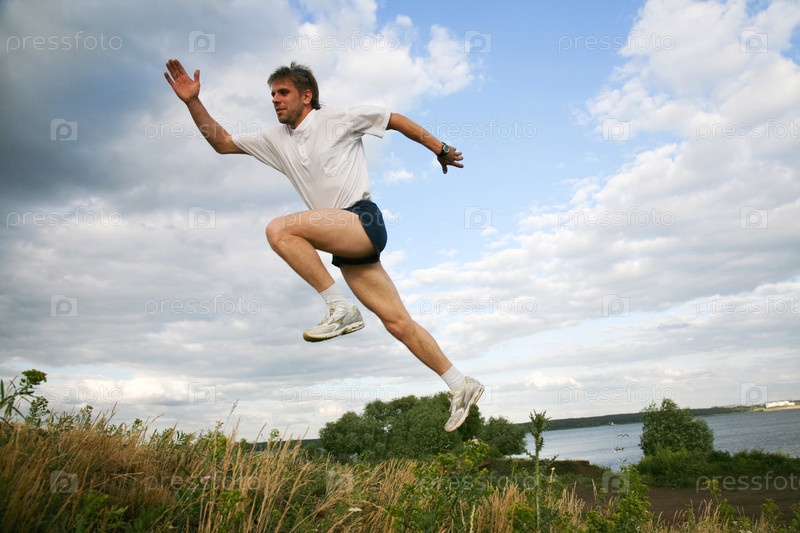 Горизонтальное изображение активного человека, прыгающего возле озера