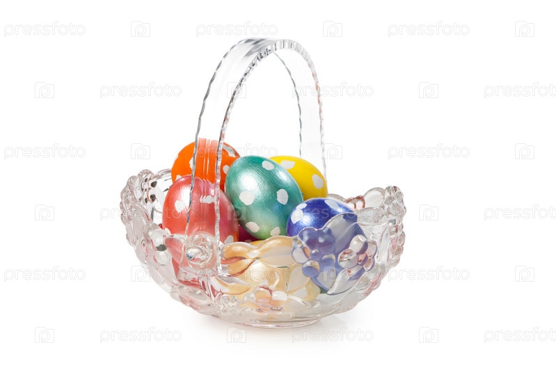 Стеклянная ваза полная пасхальных яиц изолирована на белом