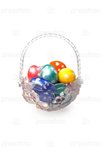 Стеклянная ваза полная пасхальных яиц изолирована на белом