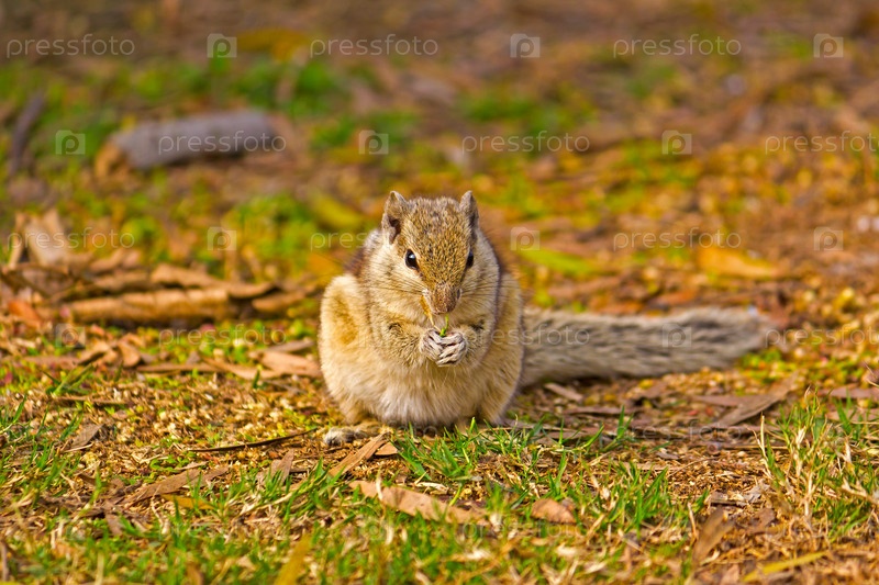 Пальмовая белка (Funambulus palmarum) питается, сидя на земле