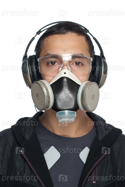 Молодой человек слушает музыку в респираторе и очках