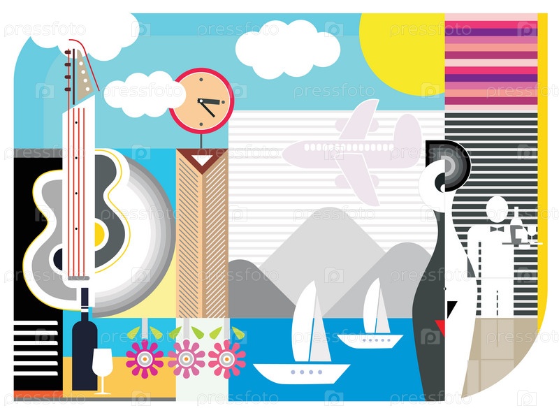 Путешествия, отдых и развлечения - абстрактный векторный коллаж, может использоваться для рекламы туристических агентств, гостиниц, ресторанов