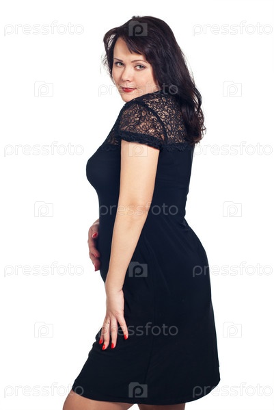 Портрет молодой беременной женщины на белом фоне