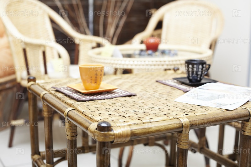 Мебель в японском стиле и желтые чашки на ней