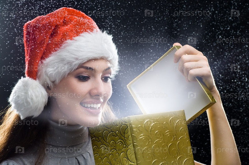 Молодая девушка с рождественским подарком в руках