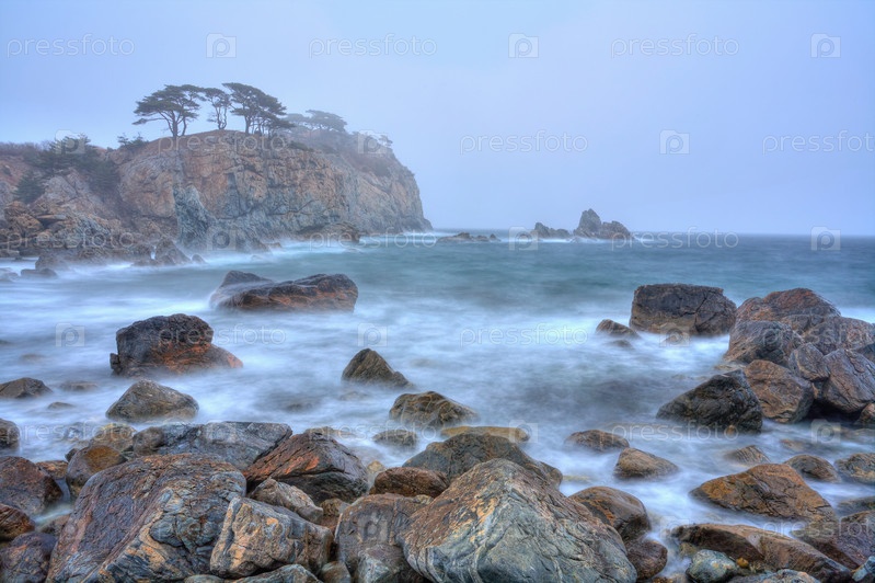 Вид на море, туман на скалистом острове