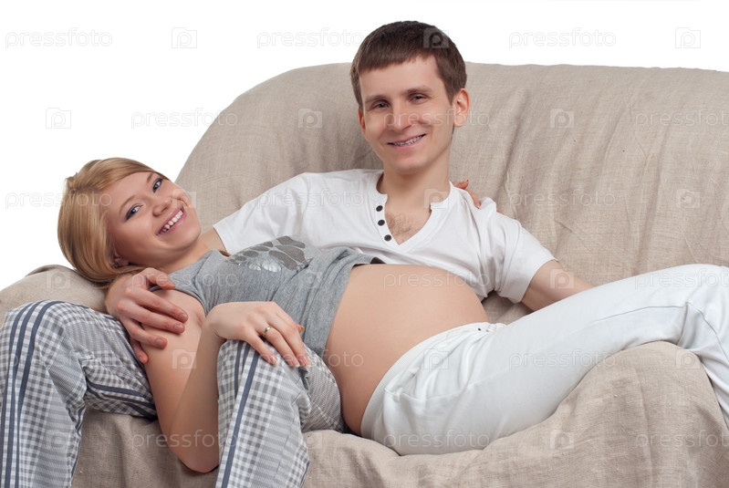 Молодая беременная женщина с мужем на диване