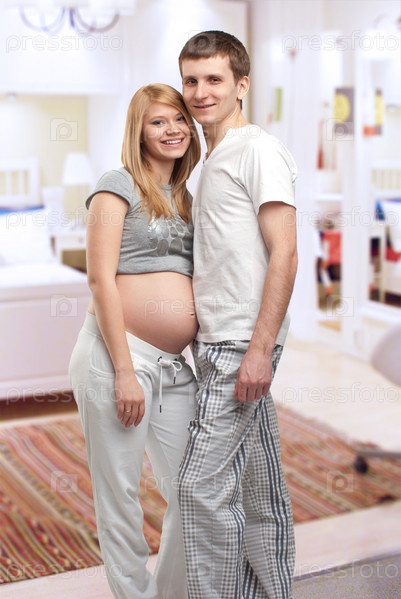 Молодая беременная пара в комнате
