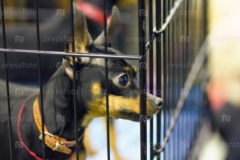 Собака породы пражский крысарик в клетке