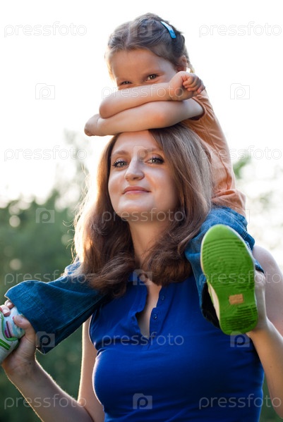Девочка сидит на плечах мамы