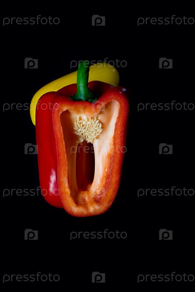 Желтый и разрезанный красный перец с семенами на черном фоне