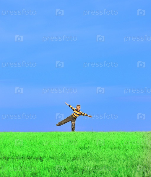 Молодой мальчик с широко раскрытыми руками на траве