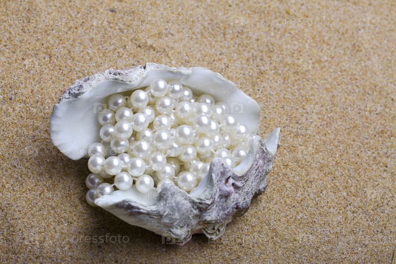 Горсть жемчуга в ракушке на песке