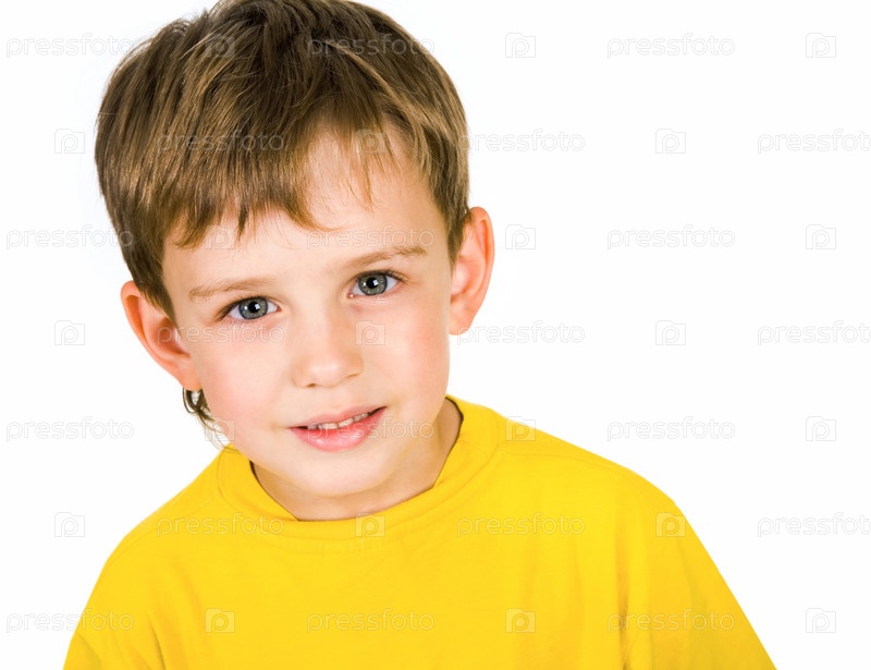 Портрет мальчика в желтой рубашке, изолированный на белом фоне