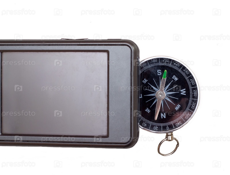 GPS-навигатор и компас в крупном плане на белом фоне