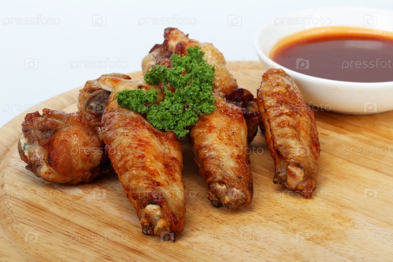 Поджаренная курица с соусом крупным планом на деревянной доске