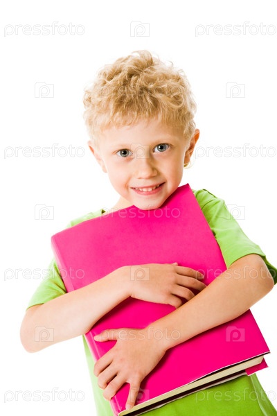 Портрет школьника, держащего учебник на белом фоне