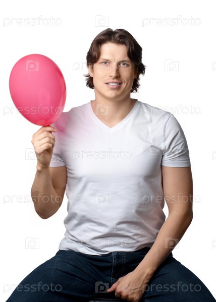 Портрет молодого мужчины с розовым воздушным шариком в руке