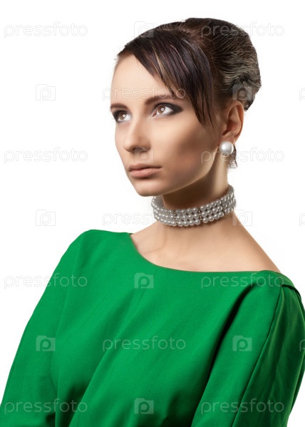 Портрет молодой красивой женщины в ретро стиле с жемчужным колье на шее