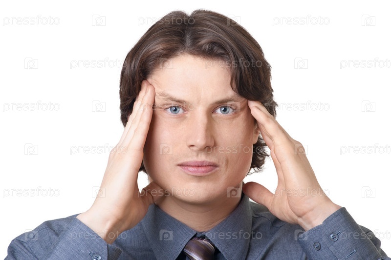 Красивый молодой бизнесмен испытывает головную боль, изолирован на белом фоне