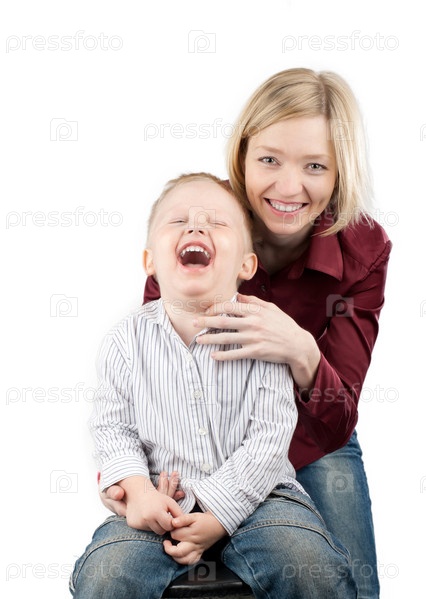 Красивая молодая женщина и ее маленький сын весело смеются