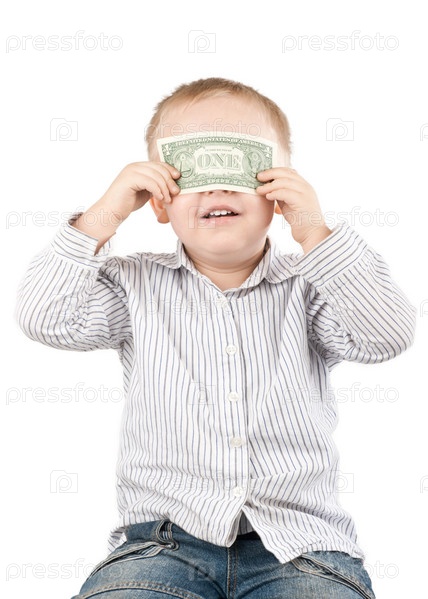 Маленький мальчик закрывает свое лицо долларом, на белом фоне