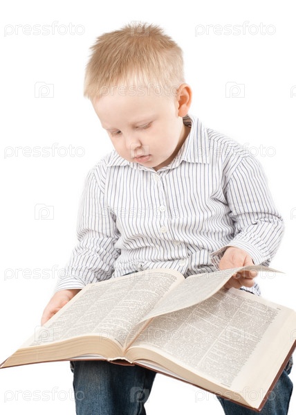 Маленький мальчик читает большую книгу на белом фоне