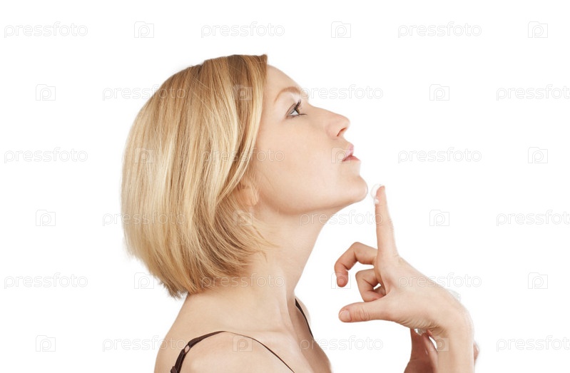 Красивая молодая женщина наносит на лицо увлажняющий крем