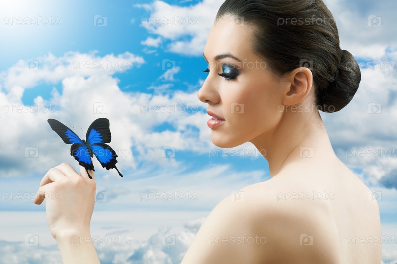 Красивая девушка с бабочкой на руке