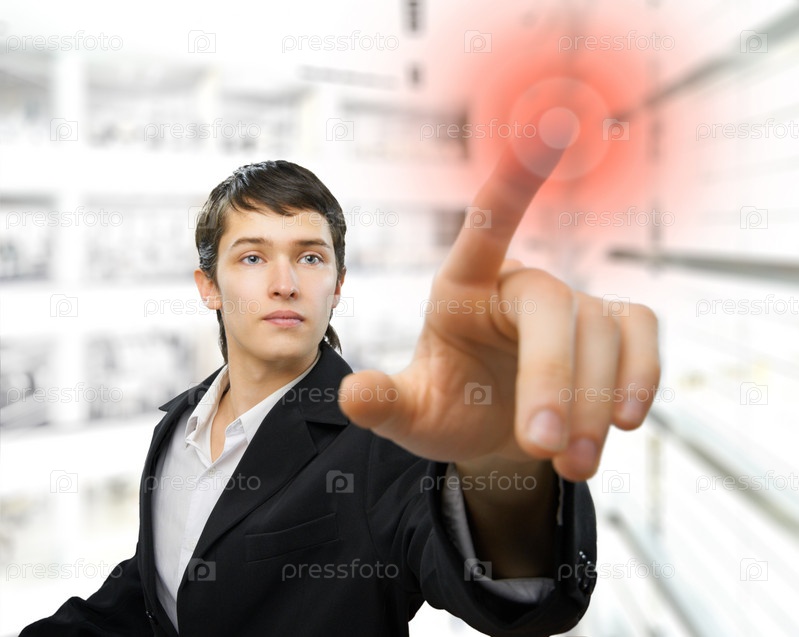 Молодой бизнесмен нажимает на сенсорный экран
