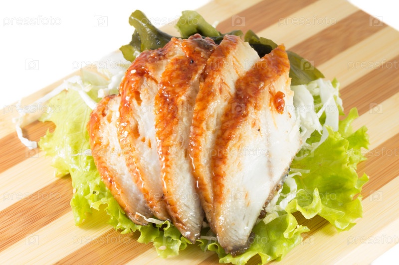 Нарезанный угорь на тарелке, изолированный на белом фоне