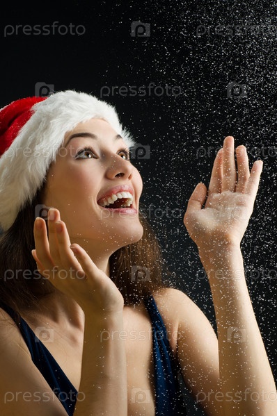 Девушка в шапке Санта Клауса радуется снегу