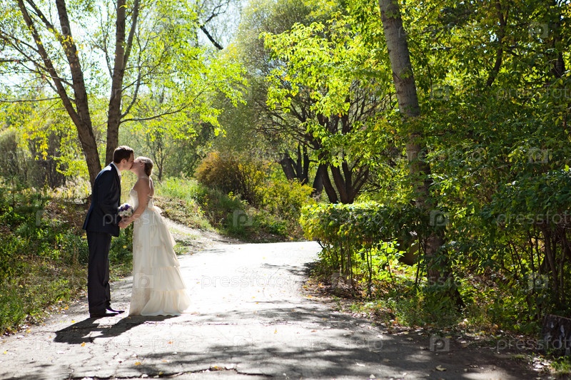 Невеста и жених целуются в парке в день свадьбы