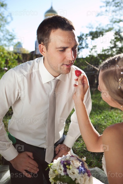 Невеста кормит жениха клубникой