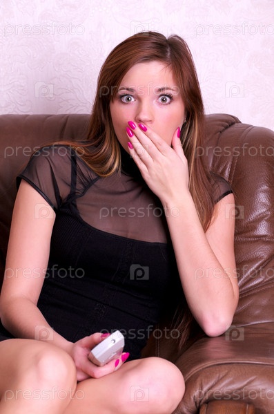 Портрет удивленной девушки с пультом дистанционного управления в руках